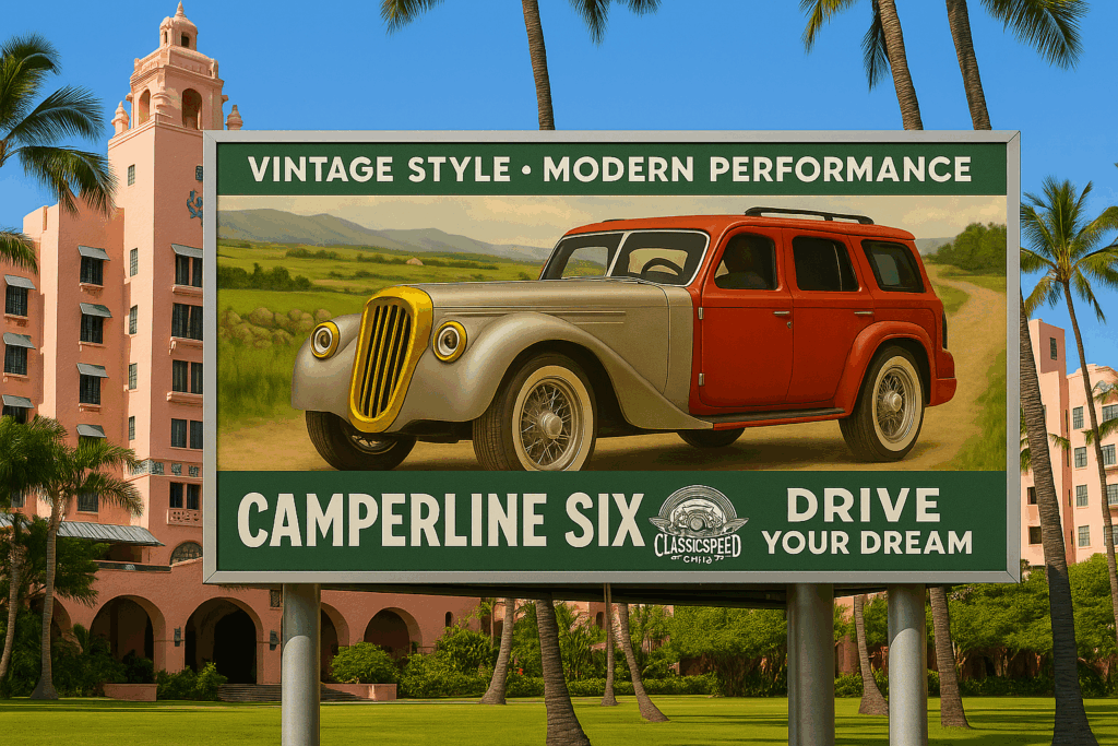 And now… here it is: the Classic Speed Cars Camperline Six. It’s a 5-seater, designed for families who love style, speed, and comfort—with a vintage twist.